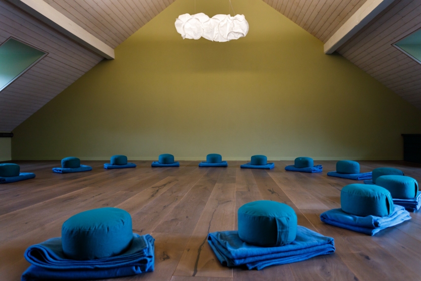 Bequeme, lockere Kleidung. Wir üben barfuss oder in Socken,